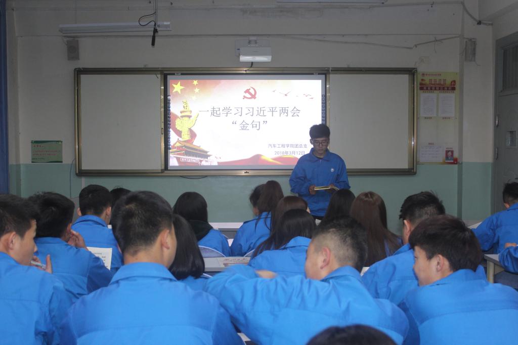 汽车工程学院团总支积极响应学校团委号召,强化“思想引领风帆计划”的落实,于312日晚,在东主教803组织团学主要干部深入学习习近平两会金句”活动