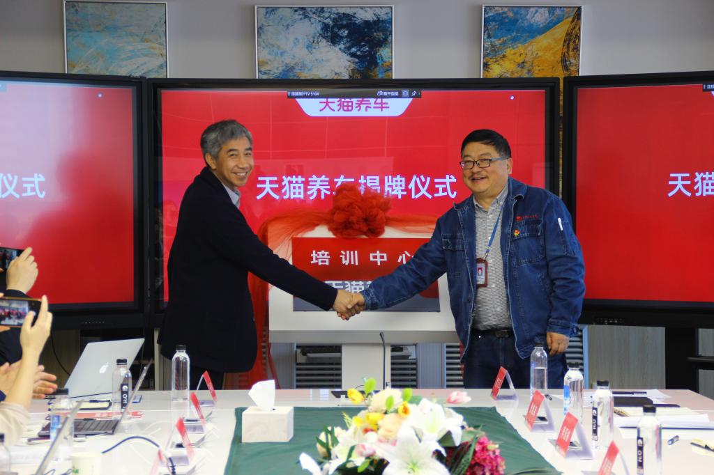 新康众集团副总裁谈春林和yl7703永利集团院长、甘肃省汽车行业职教集团副理事长孙国君共同为天猫养车培训中心揭牌。