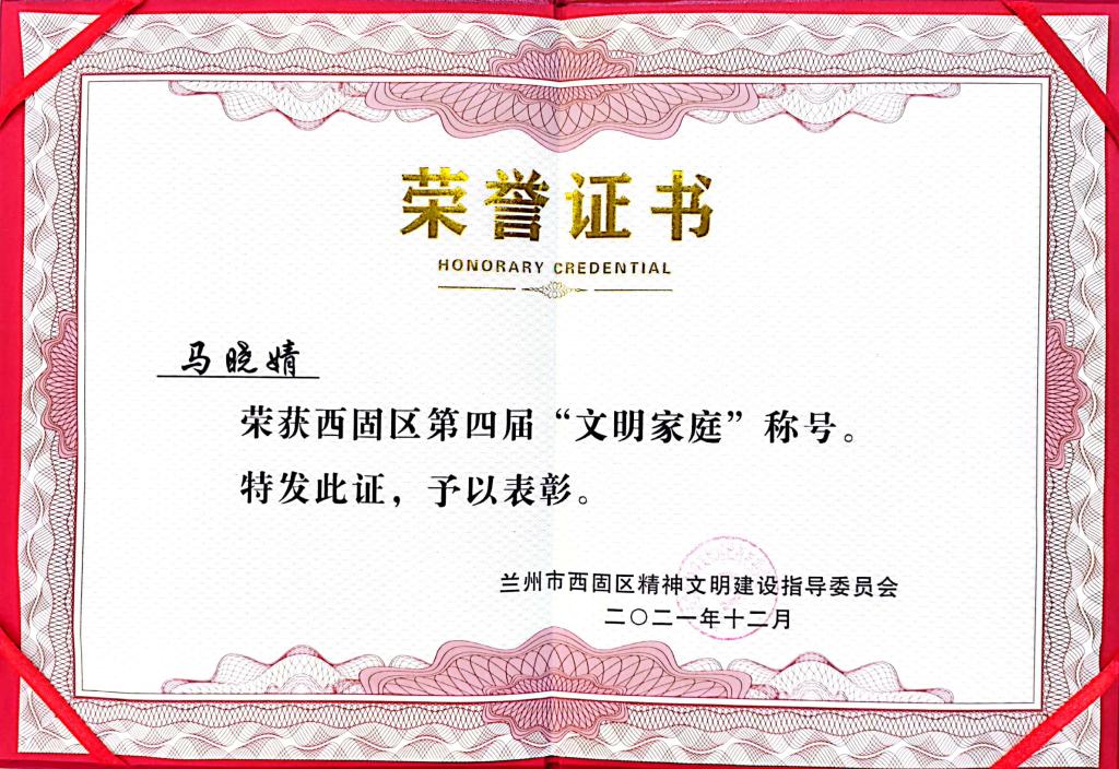 为认真贯彻落实习近平总书记“注重家庭、注重家教、注重家风”的重要指示精神,深化拓展家庭文明建设、家家幸福安康工程,充分发挥妇女和家庭在传承中华民族传统美德、弘扬良好家风方面的重要作用,大力培育和践行社会主义核心价值观,兰州市西固区精神文明建设指导委员会2021年3月启动推荐评选工作。通过各级单位推荐及评选,我校yl7703永利集团教师马晓婧家庭荣获第四届西固区文明家庭荣誉称号。