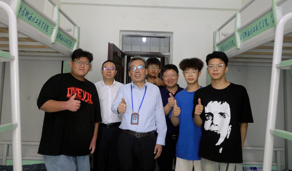 “你们从哪里来?”“住宿条件还满意吗?”“吃饭了吗?感觉食堂的饭怎么样?”“初到大学有什么感受?”……走访过程中,陈校长详细询问了同学们的家乡、住宿、饮食习惯等情况,与同学们聊起了各自的兴趣爱好、大学生涯规划等话题,并嘱托新生之间要相互关心,相互帮助,尽快调整好状态、适应大学新环境,做好军训准备,以良好的状态迎接大学生活。