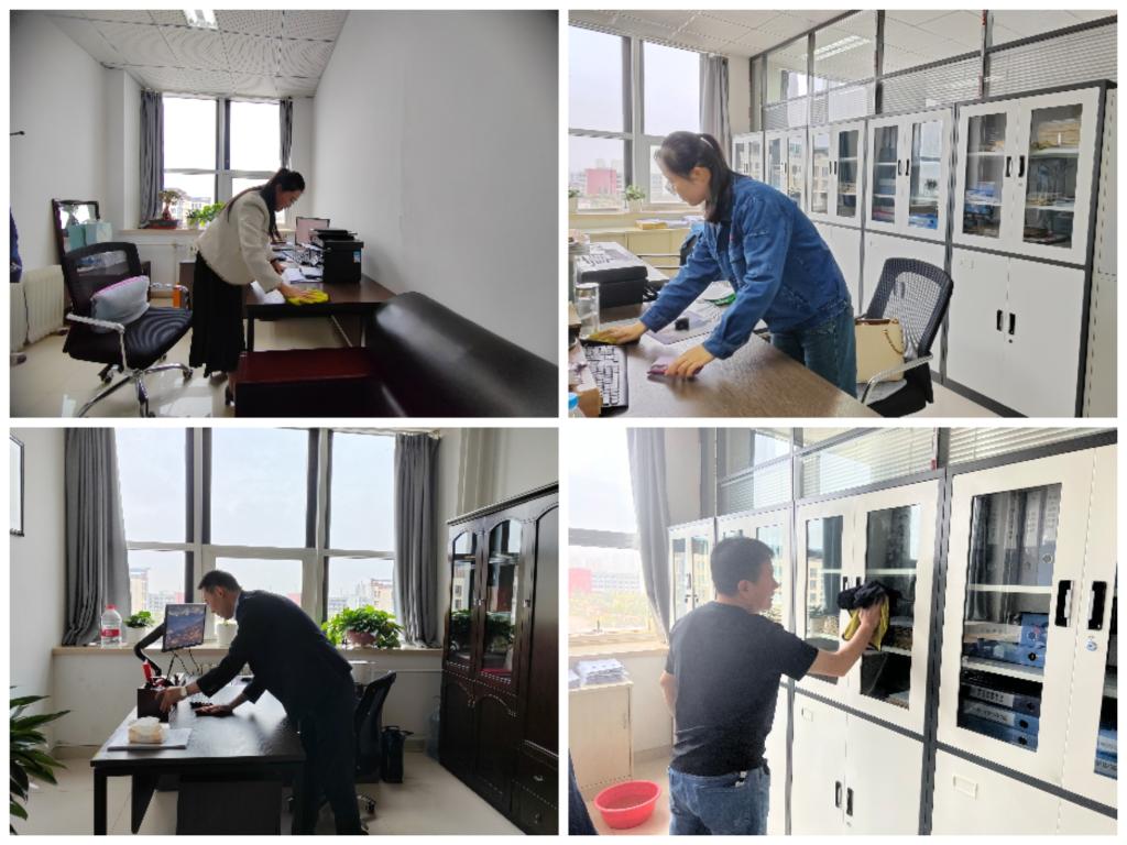 在学院领导的带领下,办公室所有老师集体行动,拿起抹布、扫帚、拖把等劳动工具,对学院办公室门窗、办公桌、地板、柜子、沙发、墙角等进行了彻底清洁。劳动过程中,老师们分工明确,各司其职,积极热情地参与其中,对办公室进行了一次彻底的净化,一些比较隐蔽,平时容易被忽略的卫生死角,也被细心清理。经过大家的努力,办公室卫生环境得到了进一步的改善,整个面貌焕然一新。