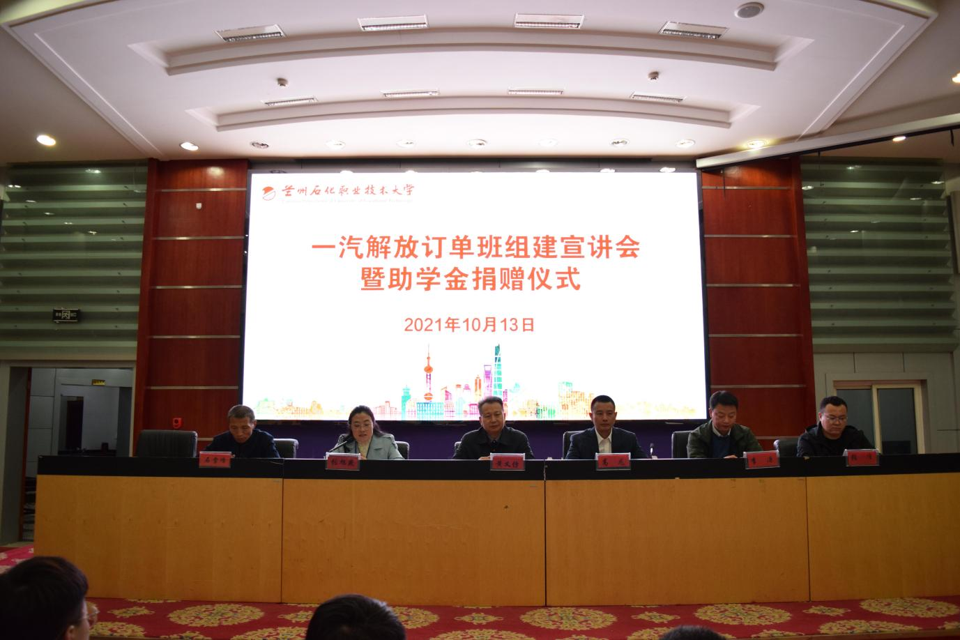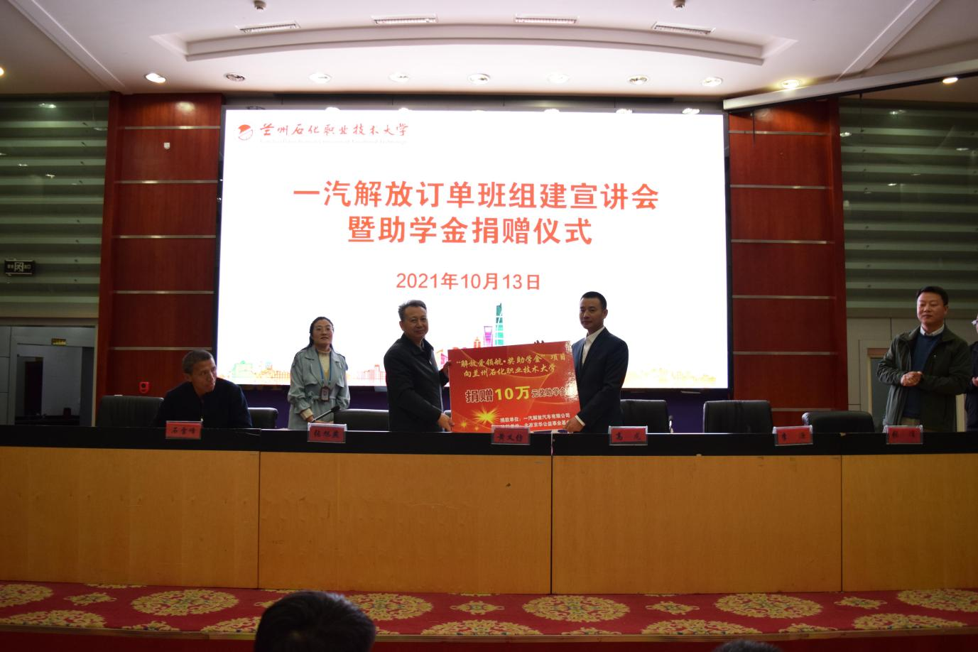 随后,学校党委副书记黄义仿与解放公司校企合作负责人进行助学金捐赠仪式,“解放爱领航 奖助学金”项目向兰州石化职业技术大学捐赠10万元奖助学金,黄书记希望受资助学生,要把滴水之恩化作“立志成才”的内力,学会自尊、自立、自强、自信,珍惜现在的学习机会,厚德博学,以技服人,把对一汽解放汽车有限公司的感激之情转化为学习的动力,立足专业,学好本领,将来为国家建设出力,为社会发展尽责。