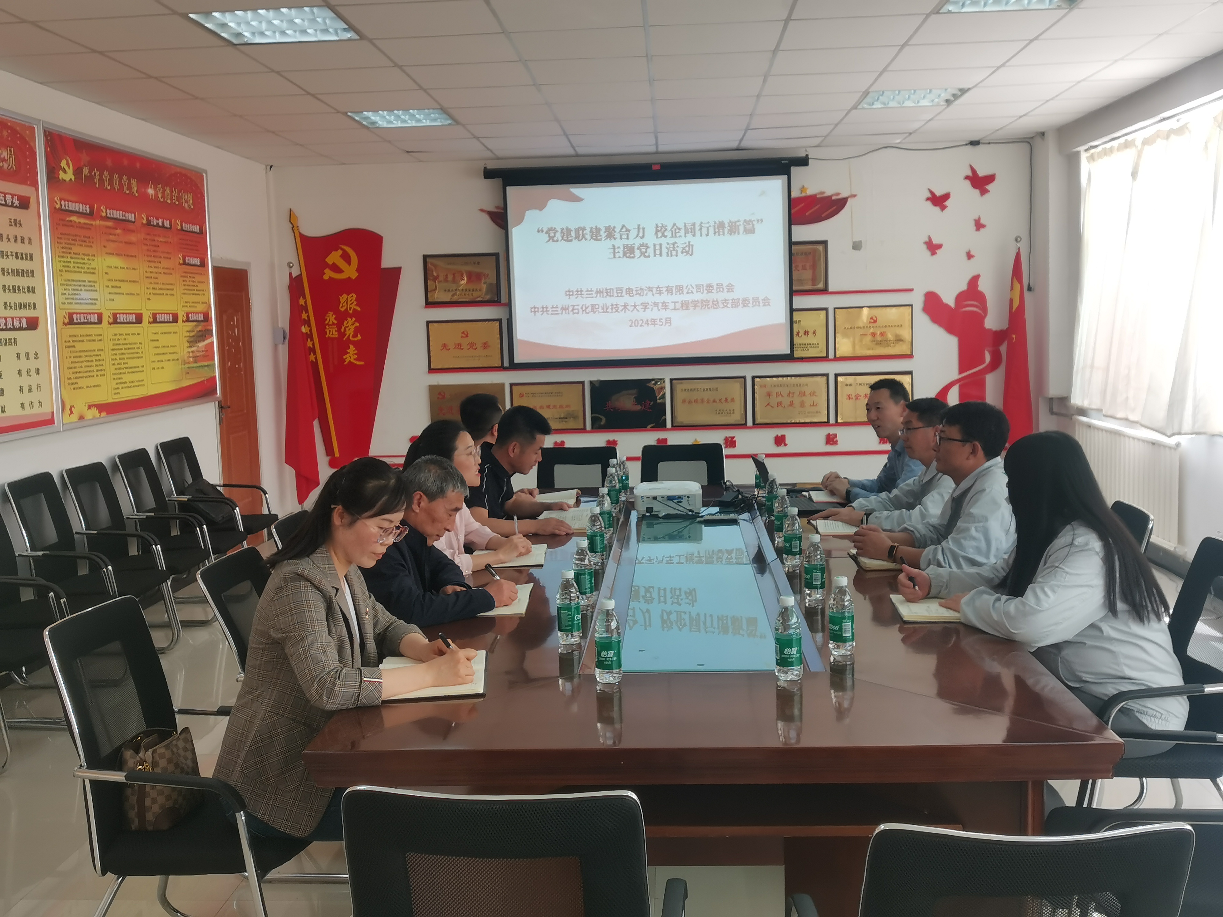 活动中,学院党总支书记详细介绍了学院党建工作和学生就业情况,她希望通过开展党支部共建活动进一步汇聚院企双方在党建方面的优势资源,促进院企党建互联互通互动,实现院企“党建共建、资源共享、发展共鸣、合作共赢”的既定目标,推动院企双方深度合作,助力院企党建融合发展,切实提升党建工作水平和联合共建的实施效果,形成更具引领性、示范性的党建品牌。兰州知豆电动汽车有限公司党委副书记全面介绍了公司发展情况,他认为,院企党组织联建合作是统一思想、凝聚力量、促进合作和共同发展的重要途径和契机。通过共同开展联学、联建人才培养基地、开展产学研合作项目等方式,实现院企双方资源共享和优势互补,为企业提供精准的人才服务和研发赋能,对破解集团发展中遇到的难题提供解决之道。随后,双方还就支部建设情况、党支部标准化建设经验、校企合作等进行了座谈交流,并深入探讨了如何以党建引领促进校企事业发展、如何优化校企合作形式和内容、如何实现校企质量化建设等工作。
